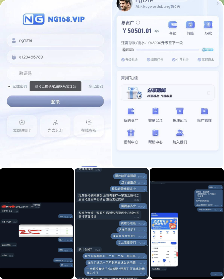 曝光内容:曝光黑台Ng体育,别名叫南宫体育,黑平台,刚开始代理信誓旦旦承诺,平台没有问题,首存进去之后,就一直卡款,多次联系客服后直接封禁内部修改我密码,我是正常体育玩家,不存在违规行为,至今也没有给我一个说法,还让我在继续充值才可以把卡在取款的钱返回体育场馆,而且提款密码,虚拟币绑定都不用通过短信验证,希望大家可以避坑。