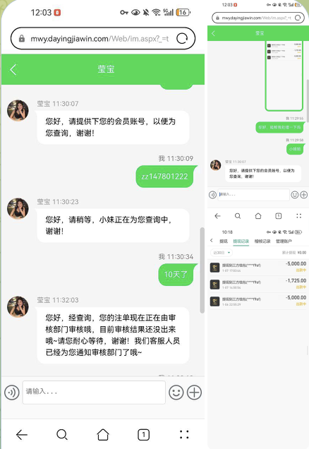 曝光内容:大赢家国际,充值1000,打到11725不给下分,一直审核,客服消息不回,天天就是审核,图片绝对真实,骗人死全家。