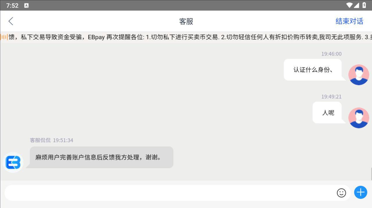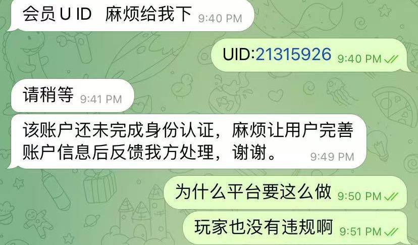 《该账户还未完成身份认证,麻烦让用户完善账户信息后反馈我方处理,谢谢。》