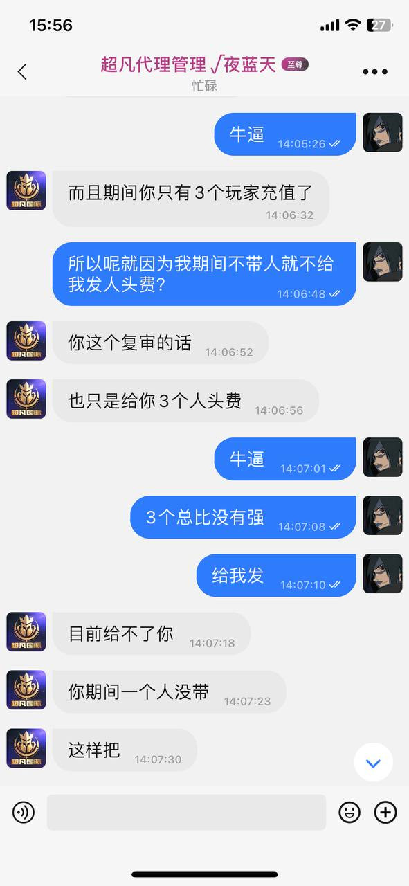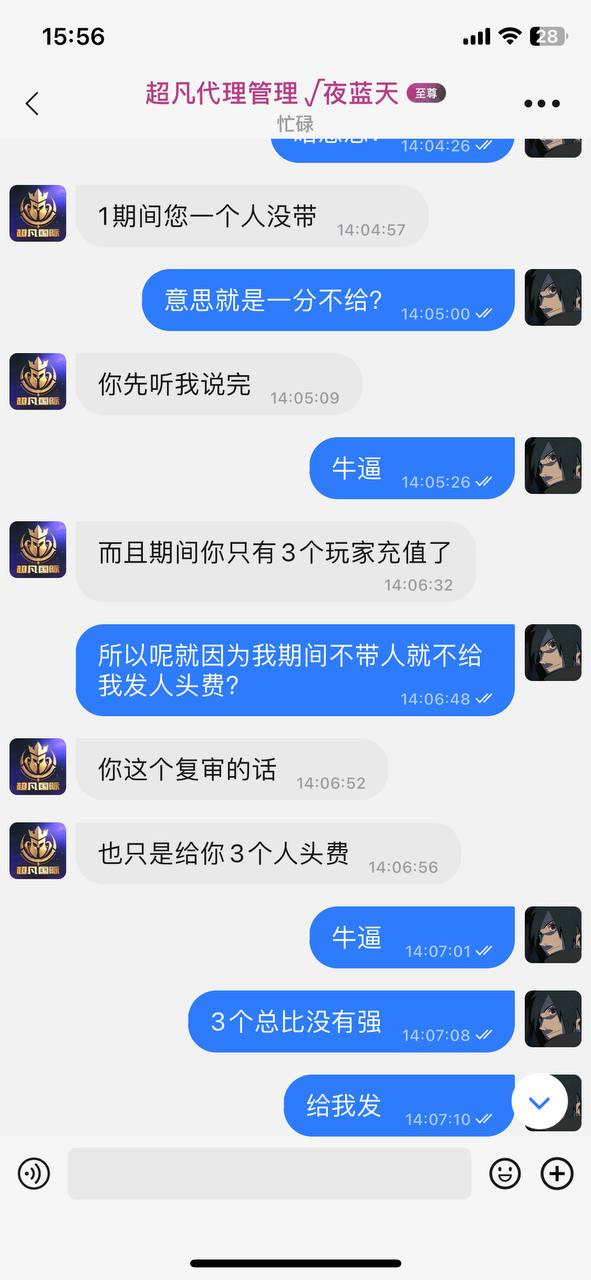曝光内容:ng集团旗下的超凡国际,人头费不发放,有效达标9个,各种理由不给发放。13号说18号复审,18号又说期间不带人,人头费都不发,谁敢带人。然后又是各种理由让我去给他们平台带新增,不管玩家还是代理,避雷这个黑台子,不是人玩的台子,ng集团旗下的台都是垃圾黑台,我的代理账号是lhx080228!