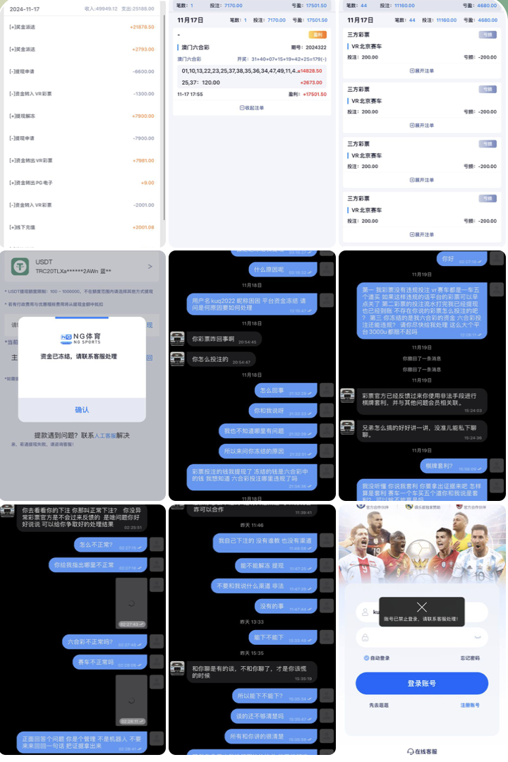 狗逼南宫体育 11月17日分别上1000.020U买六合彩和279.091u玩VR彩票 279.091UVR彩票的VR北京赛车 从人民币2000打到人民币7000多下分 显示需要再打1200多流水 就送了1300人民币回去 流水够了下分6600人民币 时间不久到账920.502USDT 等到老澳门六合彩10.30开奖 非常好 我中了25特码 一共是24000多 我就提现了22400 提现半小时不到账 我就询问平台客服 让我耐心等待 给我联系财务部门给我加急处理 两个小时点开平台 提现被拒绝 让我联系旺旺管理处理 于是下载了旺旺 联系所谓的傻逼旺旺管理 叫彪哥 18号凌晨3:00询问冻结原因要如何处理 18号晚上9:00他来一句我的彩票投注怎么回事 我当时就很纳闷 彩票我都提现 彩票有啥问题 回复慢的很 19号我说出三点问题 所谓的管理来一句官方反馈非法手段 要我自己讲做了啥 表达的那么清楚你还问我啥 接下来的今天就和个机器人一样重复得让我说我怎么用的非法手段 还说要和我合作 直到21号拿不出证据来就说不和我聊 我就该慌 我操你妈的老子赢钱就是非法手段 输钱就是我活该? 拿官网说事 台子都你做的 你和我讲官网反馈 傻逼垃圾台子 玩了两年 连3000u都黑 这点格局开你妈的台子 有在ng体育玩的朋友 看到趁早收手