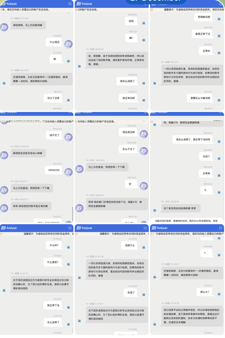 曝光内容:我才开始玩开云体育平台一个月,前面二十多天输了几万,最近这几天把本钱赢回来了,还反赢5000左右,然后提款就不给提,说我违规投注。怎么违规?哪里违规没有任何说法,就只给输不给赢,垃圾开云!我的账号WSG0319。年底了,大家小心开云准备黑钱发年终奖了!如果有被黑的朋友,请举报他们的收款账号!至少要让他们损失几十上百个收款账号。