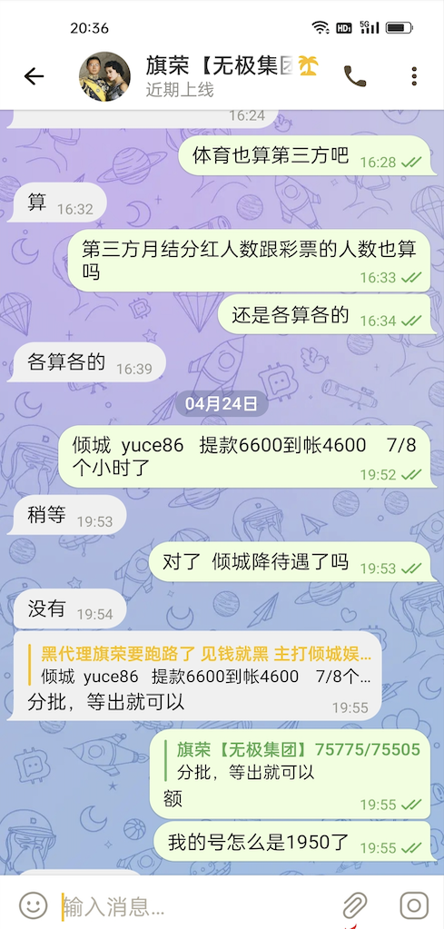 曝光内容:黑代理旗荣,主打倾城娱乐、倾城娱乐2、蓝狮、耀世,4月找他开倾城娱乐,陆陆续续玩了差不多一个月,前期输了一点没什么事,中途盈利了几天,赔率从1970降到1950,问他怎么回事,说平台不给平推,我也没说什么,然后最近连续输4天,今天好不容易盈利了,结果1.5w被黑了,号都被直接冻结了!