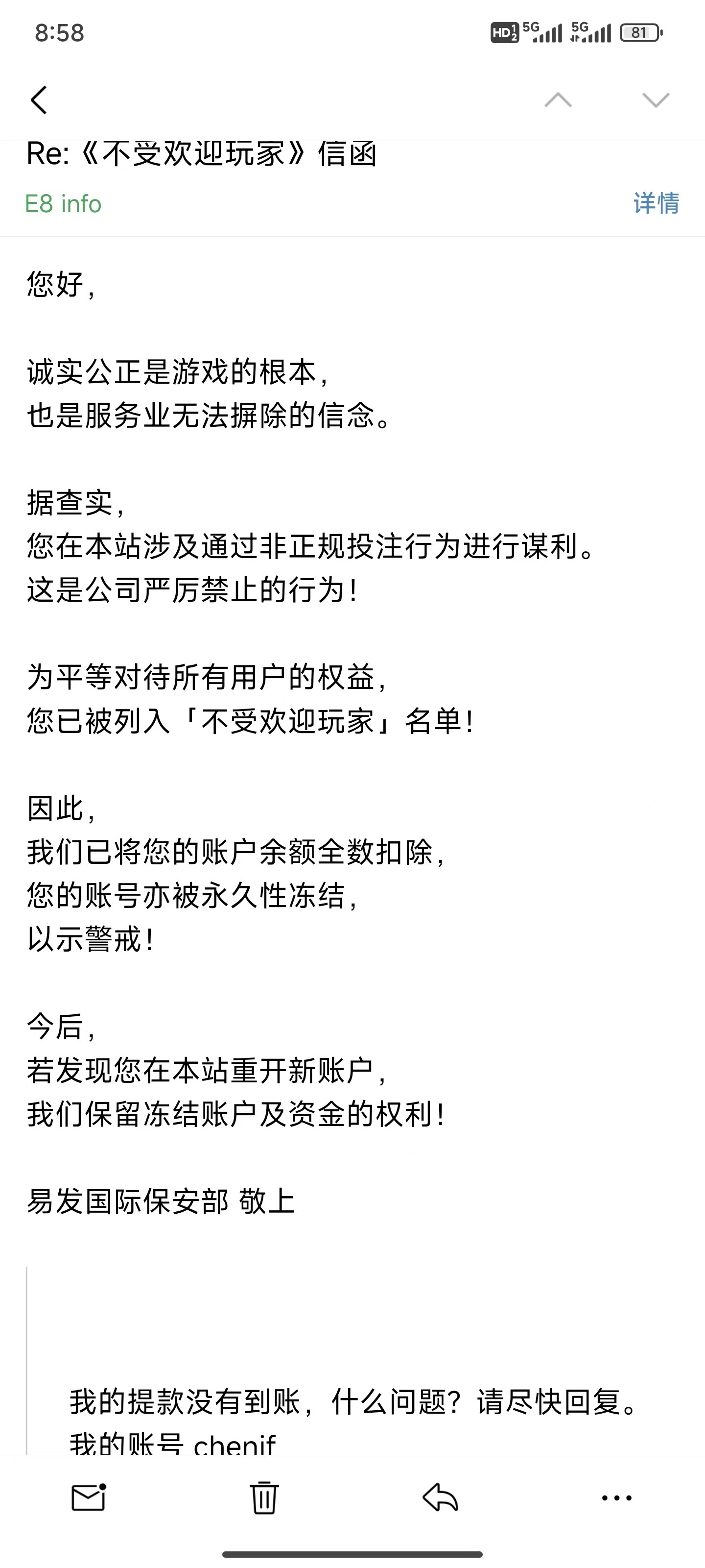 曝光内容:E8易发国际,之前一直在他家玩得好好的,隔了一年没玩了,现在回归没玩几天就不给出款,说是非正规投注行为进行谋利不给商量余地,估计是换狗庄了,或者狗庄准备跑路了,狗庄全家不得好死,狗日的,完全无口碑可言!!!