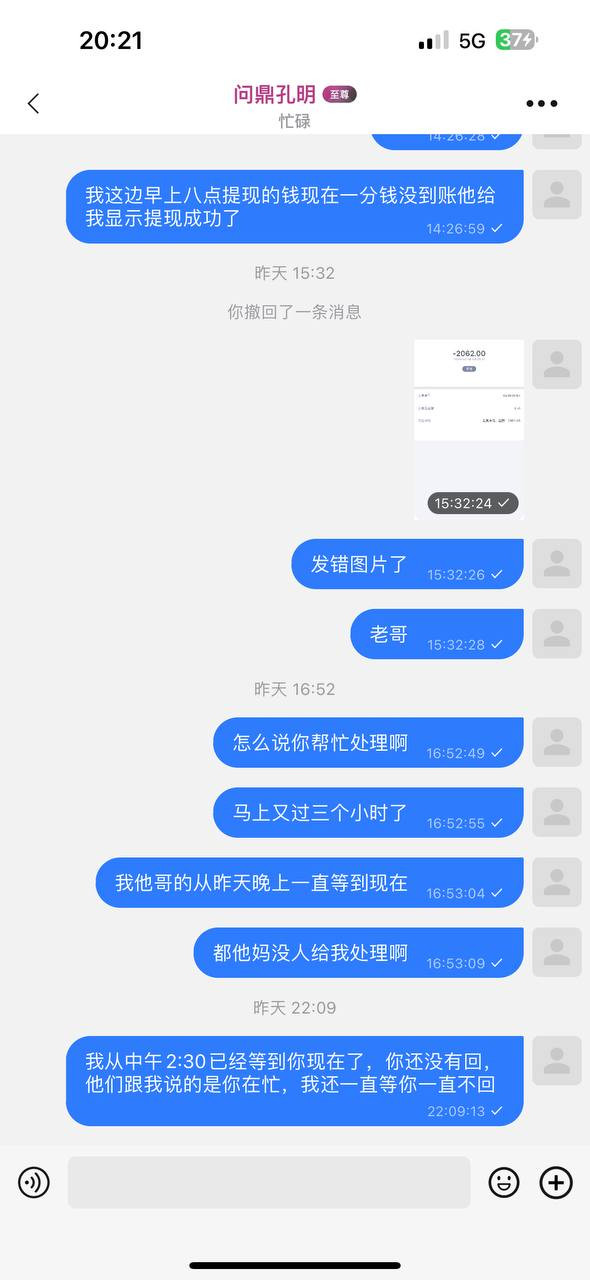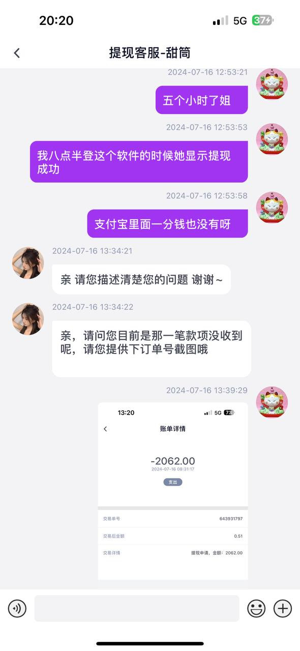 曝光内容:200上2000下款了给我黑了,我进软件还显示提现成功,去支付宝里面看什么都没有,两天了,找客服客服让我去添加管理员,找管理员等了两天一句信息不回,这么大个公司2000块钱都黑,2000块钱都不给下。