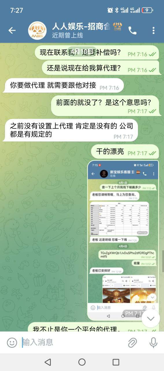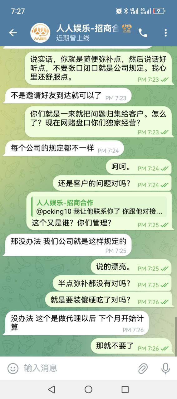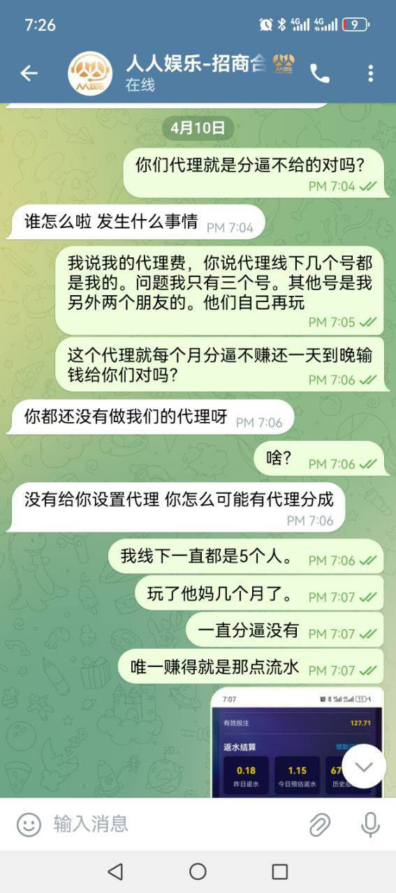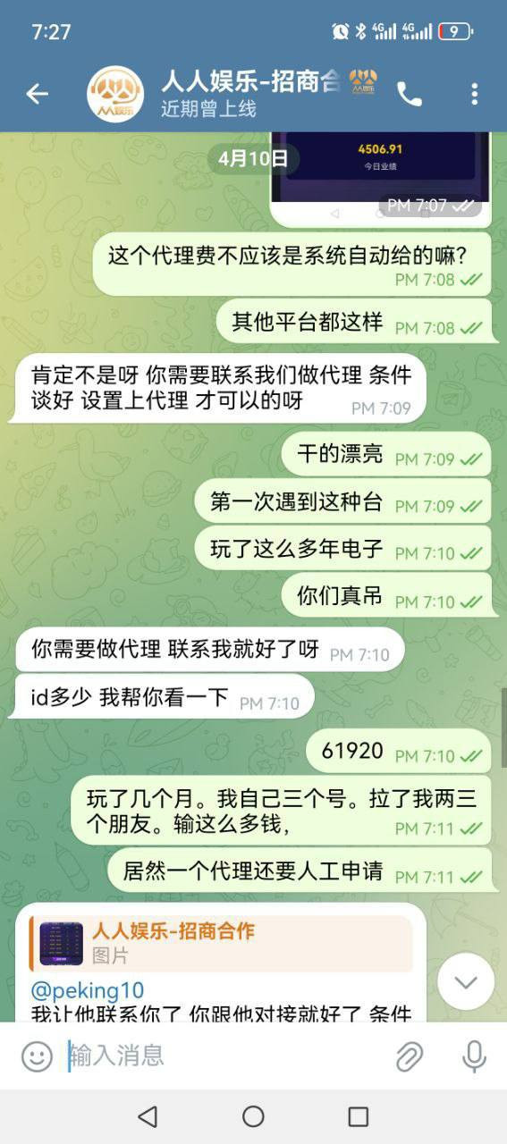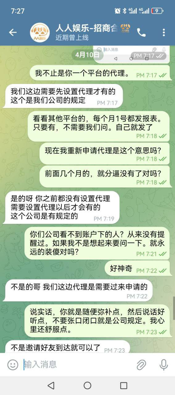曝光内容:人人娱乐,一个垃圾平台。给不起代理佣金就不要开平台,不要设置代理模式。什么都达标了,告诉你还要人工申请。