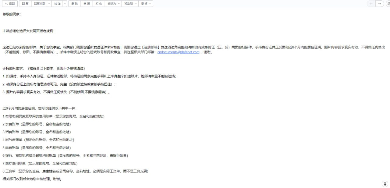 曝光内容:纯赌徒,没申请彩金,充值1.3W ,盈利1.3W,最后6K不给出款,理由就是我提供的身份证明永远不合格,我提供了3次身份证明了,都清晰到毛孔都能看清了!6K不要了,看到的兄弟远离大发,代理也早点走吧。