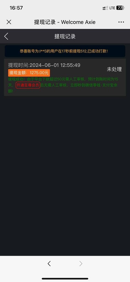 曝光内容:刚开始充值50打到260不给出,后来让我冲200再给提现,让冲黄金会员然后提现3天了不给到账,又让冲至尊会员600,总共充值1400。后面直接不回信息,给我踢出群。