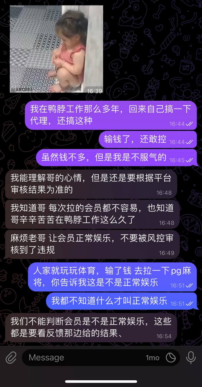 言归正传,我还是希望有人出来说一下,这种正常玩家,之前一直输钱,拉电子从2块拉到8块,爆奖了,提款被封号的操作,理由是套利,套利会去拉麻将从2块拉到8块?而且总体是输钱的,我只能说在你们眼里正常玩家的玩法就不属于正常娱乐,作为脖子老员工,我知道你们风控是不讲道理的,因为内部腐败不堪就像之前迪拜稽查打人事件,导致多少人只能酒店或者居家办公,反正集团有的是钱咯,有什么不能解决的,希望你们可以一直那么蛮横无理下去。